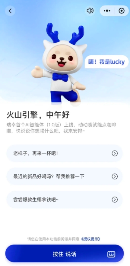 5 月 26 日,瑞幸咖啡在官方 APP 和微信小程序正式推出首个晓得智能体(1.0 版),该智能体由瑞幸咖啡与火山引擎携手打造,借助豆包大模型技术,为用户带来语音下单、个性化推荐等便捷功能,引领咖啡消费进入全新智能化时代。